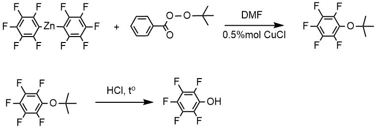The zinc-organic compound solution thus obtained was oxidized with tert-butylperoxybenzoate in the presence of cuprous salts CuX, where X = Cl, Br, I (method A ) to give pentafluorophenol tert-butyl ether. Further refluxing of tert-butyl ether of pentafluorophenol with hydrochloric acid gave pentafluorophenol. A total yield of the product (99% pure) was about 70%.