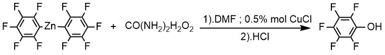 Further searches of the approaches to the preparation of pentafluorophenol and other polyfluorobenzohydroxybenzenes from corresponding aromatic acids have led us to investigation of an oxidation of zinc-polyfluoroaromatic compounds. The advantage of zinc-organic compounds in comparison with magnesium-organic compounds is their greater stability, which makes it possible to work with them not in ethers but in polar aprotic solvents such as DMF.