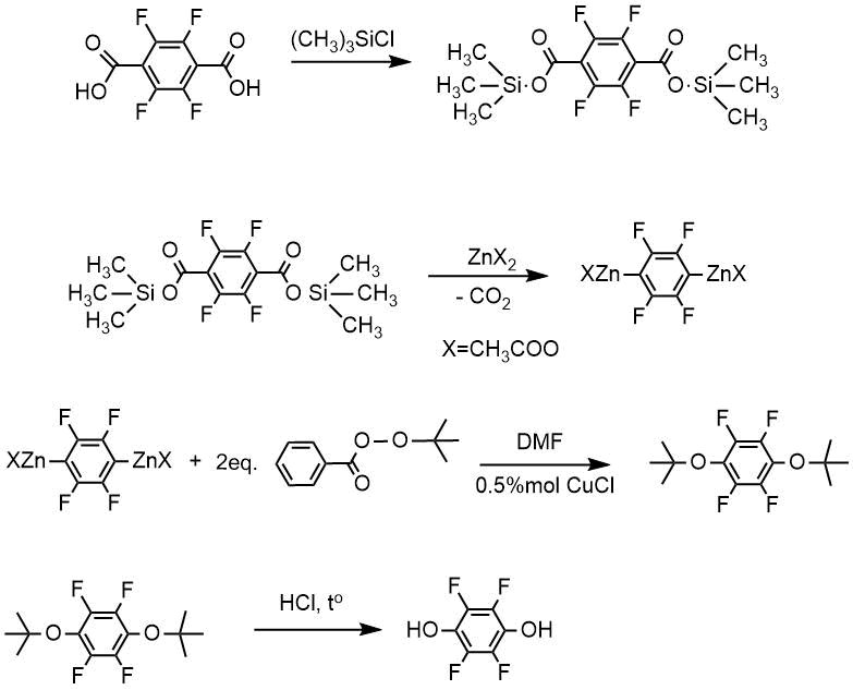 DMF (250 ml) and anhydrous zinc acetate (38,5 g) were added to tetrafluoroterephthalic acid bis (trimethylsilyl) ester (80,2 g, 0,21 mol) and the reaction mixture was heated while distilling off trimethylsilyl acetate and decarboxilation. After the completion of the gas evolution the reaction mixture was cooled to 0°С, CuCl (0,2 g) was added and tert-butylperoxybenzoate (81 g , 0,42 mol) was added dropwise. The reaction mixture was stirred for additional 2 hr at 0 оС and 6 hr at ambient temperature, poured on ice mixed with 10% HCl solution, a lower layer was separated. Two volumes of hydrochloric acid were added to the lower layer, the resulting mixture was refluxed for 3 hr, and then cooled, the water (upper) layer was decanted, the lower layer was distilled to yield tetrafluorohydrohinone (30 g) of 99% purity. The yield 80%.