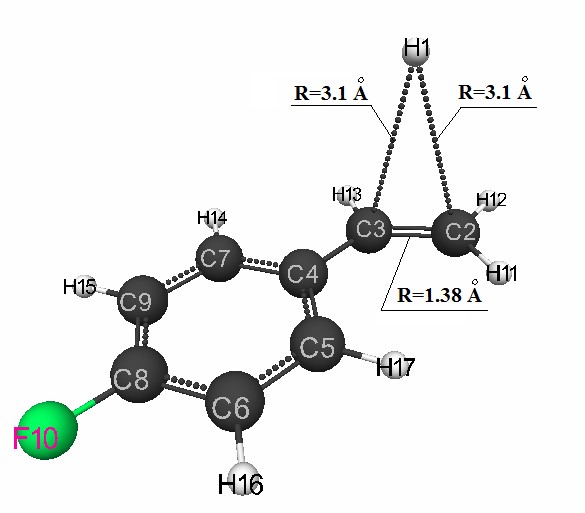 Table 1. Changes in bond lengths along the path of the H1 proton addition reaction to the α-carbon atom of a p-fluorostyrene