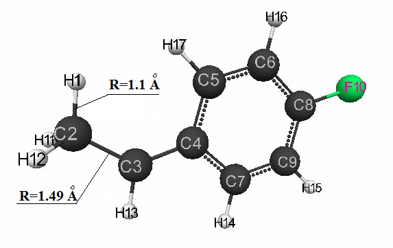 molecule is shown in Fig. 1. Fig. 1. The initial model of the attack of proton of the molecule p-fluorothyrene. For the visual presentation of molecular models was used the well-known program MacMolPlt [5].3Volgograd State Medical University, 400131 Volgograd, Pavshich bortcov Square, 1
