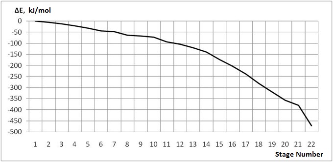 follow the classical scheme in accordance with the Markovnikov rule. Fig.2. The structure of the formed carbocation (I) after the attack of the proton H1 of the α - carbon atom of p-fluorostyrene (C2) Fig.3. - The structure of the formed carbocation (II) after the attack of the proton H1 of the β– carbon atom of p-fluorostyrene (С3) Fig. 4. Potential surface of the energy of the interactions of the proton with p-fluorostyrene. Fig. 5. The change in total energy at the accession of the proton H1 to the α–carbon atom of p-fluorostyrene