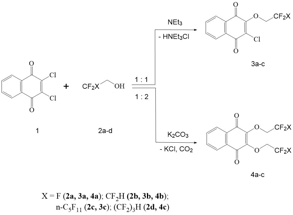 To formation of 2,3-bis-(polyfluoroethoxy)-[1,4]-naphthoquinones (4а-с) in reaction 1 and polyfluorinated alcohols 2а,d, catalysts that are more basic than NЕt3, as HCl acceptors, are required. In the case of reaction of 2,3-dichloro-[1,4]-naphthoquinone with non-fluorinated carbinols, the best yields are obtained by carrying out the reaction in alcohol in the presence of corresponding alcoholate [12]. Good results have also been obtained in case when these transformations are carried out in DMSO or CH3CN and in the presence of alkali metal carbonates [13].