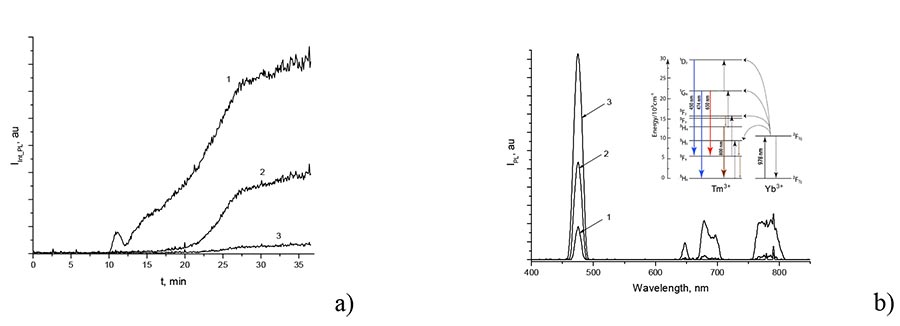Figure 1. (a) Time dependences of integral intensity IPL PL of -NaYF4/Yb/Tm phosphors at a wavelength ranges of 480±25 nm, 650±20 nm and 790±45 nm. (b) IPL PL spectrum for IPL nanoparticles after 13 (1), 21 (2), 37 min (3) after heating on. The inset shows a simplified system of Yb and Tm energy levels. Arrows indicate the radiative transitions.