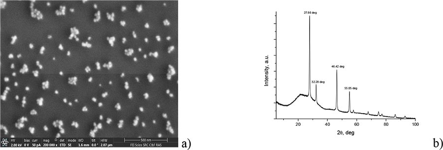 Figure 2. Photograph of synthesized -NaYF4/Yb/Tm nanoparticles obtained via scanning electron microscope (a), and their diffractogram obtained via Rigaku Miniflex600 X-ray diffractometer (Cu, λ = 1.54184 Å) (b). Θ is angle of incidence of X-ray beam on the sample.