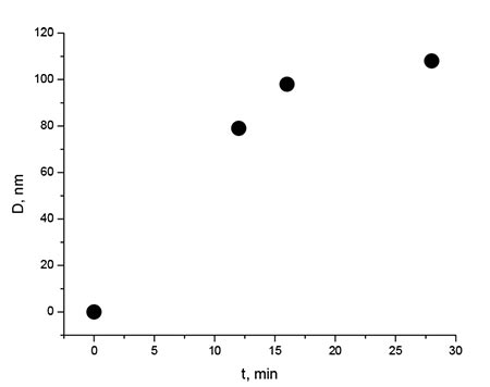 In Fig. 4 shows the dependence of average particle diameter D on synthesis time. It follows from the comparison Fig. 4 and Fig. 1 that there is a clear correlation between the size of synthesized nanophosphors and photoluminescence intensity of reaction mixture. This fact is important because it allows you to stop the reaction at the time when the particle size reaches the target value.
