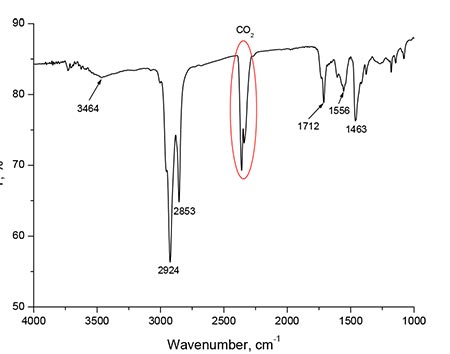 As noted above, the synthesis of fluoride micro- and nanocrystals NaYF4/Yb/Tm, NaYF4/Yb/Er was carried out in oleic acid/1-octadecene mixture. This leads to the fact that the particles obtained during this synthesis are, as a rule, in organic cladding based on oleic acid [16-18]. In Fig. 5 shows the transmission spectrum of α-NaYF4/Yb/Tm nanophosphorus powder at KBr substrate. The absorption band near 3464 cm-1 can be associated with O-H compression vibrations. Strong absorption peaks near 2853 and 2924 cm-1 are associated with symmetric and asymmetric vibrations of C-H of organic cladding of oleic acid nanoparticles. Additionally, the peaks near 1556 and 1463 cm– 1 are apparently due to asymmetric and symmetric vibrations of carboxyl COO groups, respectively [3]. Thus, from the analysis of Fig. 5, it can be concluded that all nanoparticles are coated with organic cladding based on oleic acid.