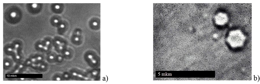 As follows from Fig. 6a, diameter of organic particles claddings can be 4 or more times the diameter of particle itself, which leads to a difference in measured particle sizes using scanning electron microscopy and dynamic light scattering methods. In Fig. 6b, the hexagonal shape of two particles with diameters d≈1.5 and 1.1 μm is clearly visible, which indicates that these particles are in hexagonal β-phase. From Fig. 6b it also follows that, as a synthesis result, in addition to particles within the order of 1 micron, the smaller particles with a diameter of ≈300 nm are formed (upper-bound estimate). The shape of these particles is not determined due to limited resolution of Neophot-32 microscope at a wavelength of 355 nm. Using of optical microscope with immersion objectives, larger numerical aperture (for example, NA = 1.5) and shorter wavelength λ= 248 nm will allow to analysis of nanophosphors with a diameter from ≈200 nm.