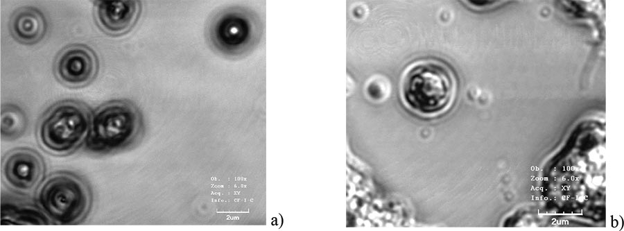 Comparison of formulas (2) and (1) shows that resolution of confocal microscope is approximately 1.39 times better than the resolution of wide-field optical microscope with the same wavelength. This is due to the fact that diameter of Airy disk in confocal microscope is somewhat smaller than in wide-field microscope. In Fig. 7 shows photographs of β-NaYF4/Yb/Er nanoparticles at silicon substrate, obtained via LEXT OLS3100 confocal microscope with 100x/0.80 “dry” objective and a 100x/1.00 water-immersed objective. One can see both individual particles with diameter of d≈300 nm in organic cladding and agglomerates of particles.