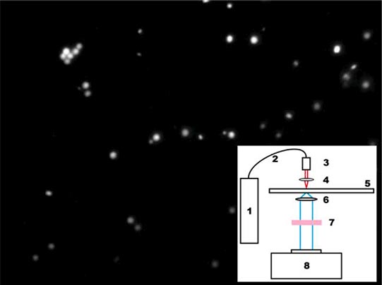 Figure 8. Photograph of luminescent β-NaYF4/Yb/Er particles pumped by IR light radiation at a wavelength of 980 nm. The inset here shows the installation diagram for studying the PL spectra of particles and their agglomerates in upconversion. 1 - pumping laser, 2 - fiber-optic cable, 3 - collimator, 4 - 20x objective, 5 - stage for sample, 6 - Neophot-32 microscope objective, 7 - optical filter that cuts off pumping radiation, 8 - CCD camera