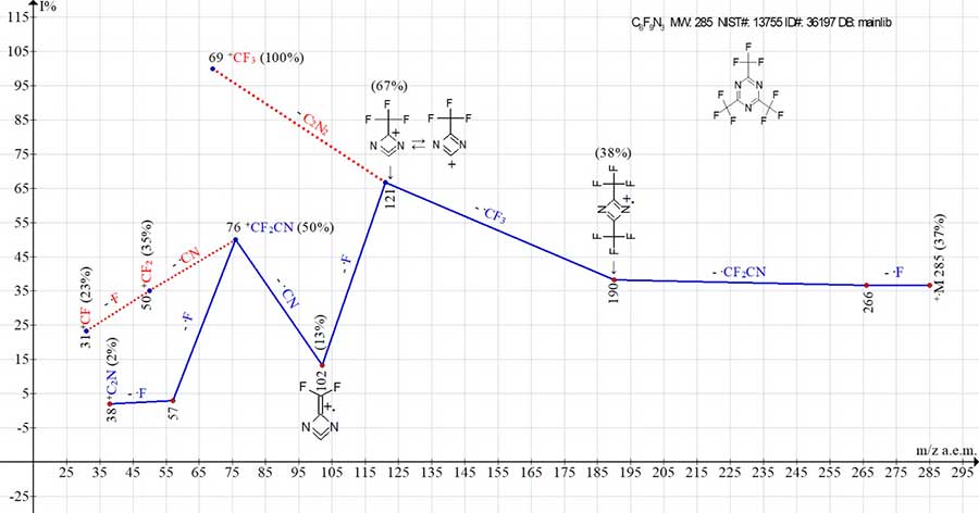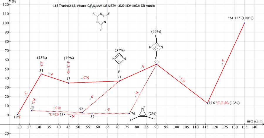 During ionization, the peak of +.C3F3N3 molecular ion (which has a minimum mass of 135 a.m.u.) acquires the maximum energy and maximum intensity. However, detachment of one fluorine atom from +.C3F3N3 leads to a sharp decrease in peak intensity of +.M-.F with m/z 116 (13%). The reason for destabilization of triazine cycle is the loss of one of three symmetrical fluorine atoms. The next ejection of.CN radical leads to formation of a stable symmetrical dimer +.[FCNNCF] with m/z 90 (55%).