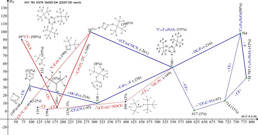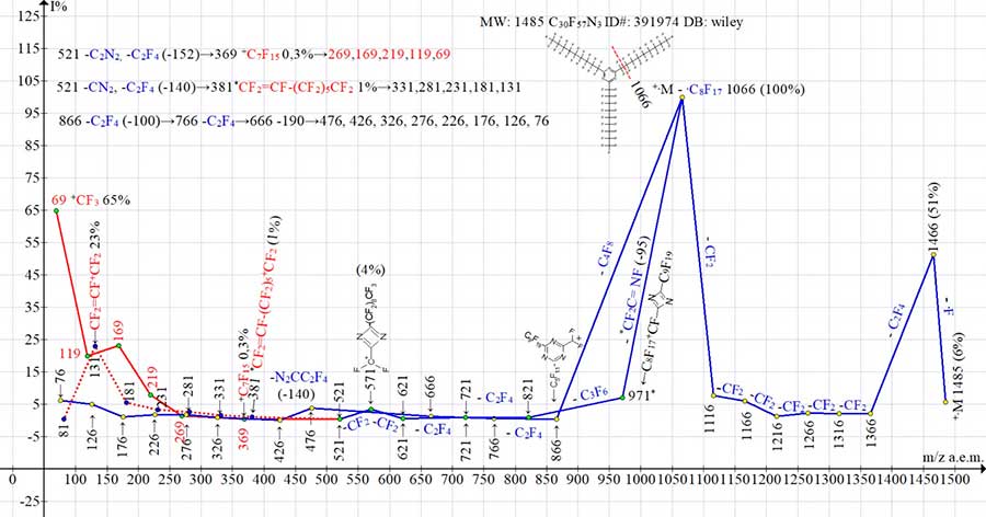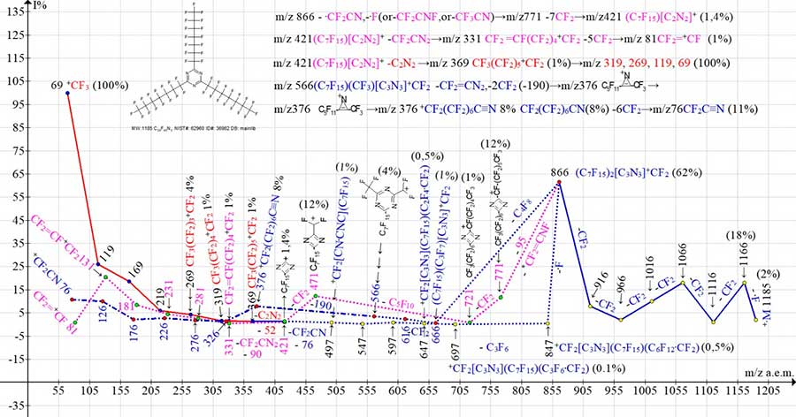 The third way of fragmentation of ion with m/z 866 is detachment of fluorine atom from second, not yet fragmented substituent, with formation of radical C7F15[C3N3](C6F12.CF2)(+CF2) with m/z 847 (0.5%) . The next detachment of C3F6 molecule probably also occurs from the second one, which began to fragment the C6F12.CF2 substituent. Detachment of C3F6 also leads to radical cation C7F15[C3N3](C3F6.CF2)+CF2 with m/z 697 (0.1%).