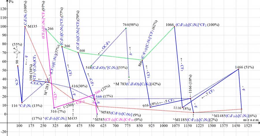 In spectra of homologues C24F45N3 and C30F57N3 after detachment of fluorine atom, only the ejection of six CF2 groups and, accordingly, the ejection of C2F4 and six CF2 groups leads to intense peaks of fragment ions with two symmetrical substituents and one CF2 group: ((C7F15)2[C3N3]+CF2 with m /z 866 (62%) and (C9F19)2[C3N3]+CF2 with m/z 1066 (100%). The increase in peak intensity with m/z 1066 (100%) compared to intensity of peak at m/z 866 (62%) is the result of difference in intensities of its molecular and fragment peaks +.M-.F. Ions with intense peaks are fragmented in several ways, which leads to branching of ionic series.
