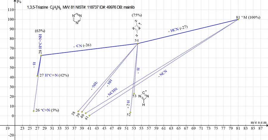 In Fig. 2 the main ionic series of 1,3,5-triazine is marked with blue line, and the side fragmentation series - with dotted lines.