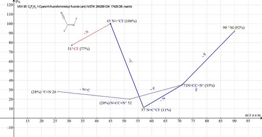 Figure 3. Mass spectrum of ion series for (E)-2,3-difluoroprop-2-ennitrile, MW:90 C2F2N2