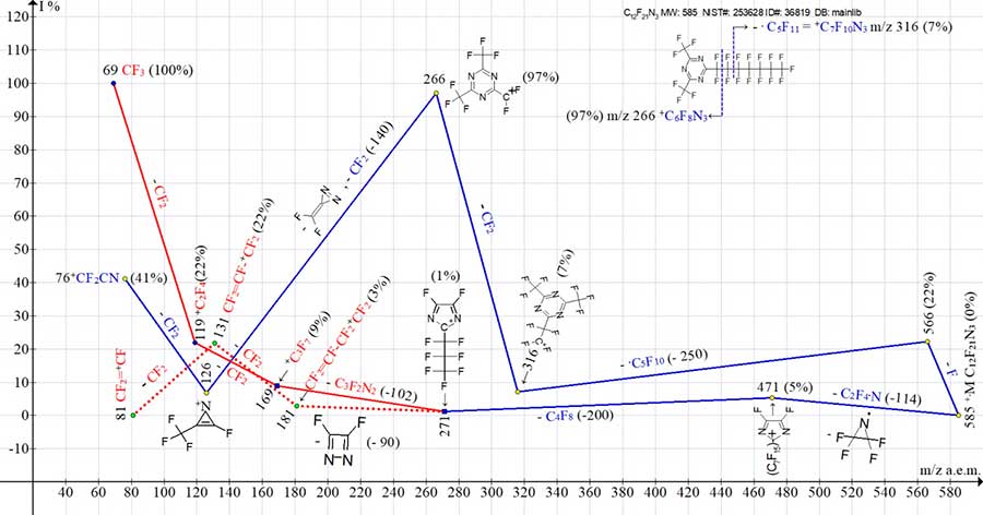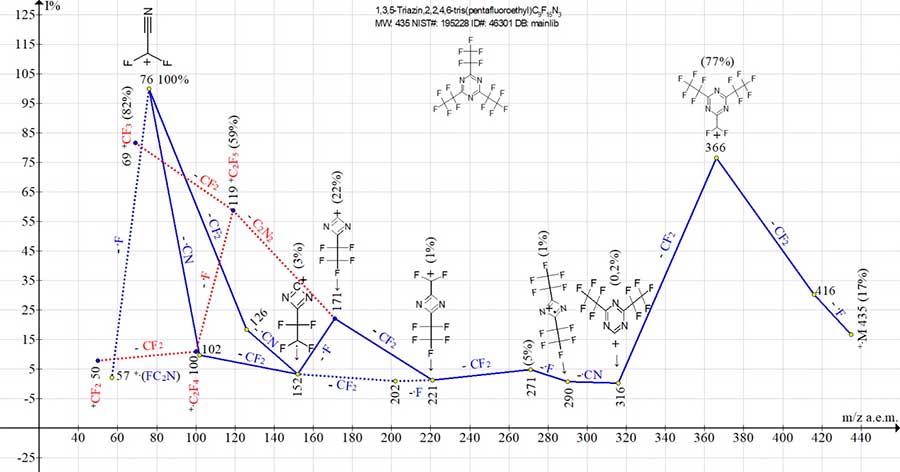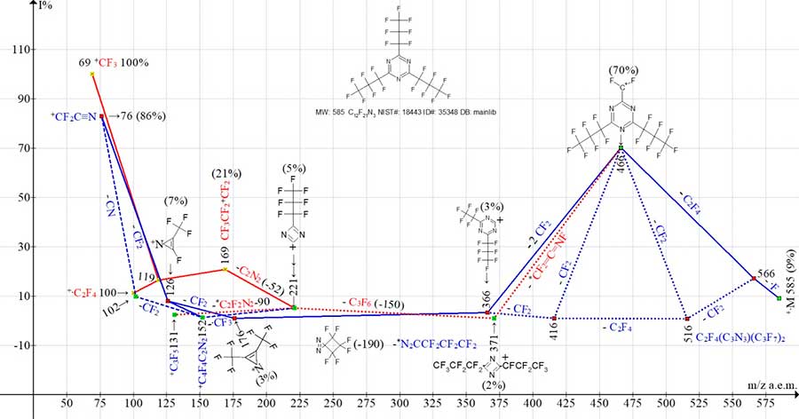 As a result of detachment of .F and C2F4, the first intense peak appears with m/z 466 (C3F7)2[C3N3]+CF2 (70%). It fragments in two ways. Detachment from the ion with m/z 466 (-2 CF2) leads to ion with m/z 366 (3%), forming a series of ions: with m/z 176 (3%), 126 (7%) and 76 (83%) (marked with blue lines).