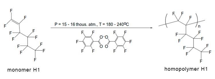 Figure 1. Scheme for synthesis of perfluorohex-1-ene homopolymer H1 by radical polymerization at ultrahigh pressure using a perfluorinated peroxide initiator. n is the number of units in the homopolymer macromolecule.