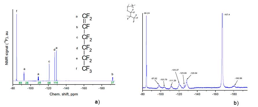The assignment of signals in 19F NMR spectrum of monomer H1 to corresponding groups of atoms a, b, c, d, e, f is given in Figure 2a. Let us analyze the positions of 19F NMR signals and their assignment to molecular groups for homopolymer H1 (see Figure 2b). First of all, we note that the signal is -167.4 ppm in this figure is associated with solvent - hexafluorobenzene in which the homopolymer was dissolved. Broadened singlet at -84.24 ppm corresponds to three fluorine atoms in trifluoromethyl group in the side substituent of polymer macromolecule (this signal is also visible in Figure 2a). At the same time, the signal nearby is 192.2 ppm, due to the presence of a double C=C bond in monomer molecules (see signal “b” in Figure 2a), in Figure 2b is missing. This indicates the absence of such bonds in synthesized homopolymer.