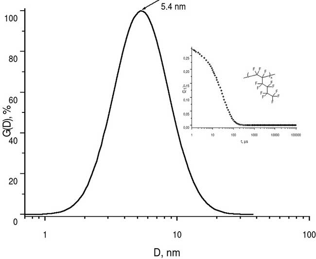 Figure 3. Histogram of size distribution of homopolymer H1 macromolecular globules, measured by dynamic light scattering method in perfluorooctane, where D is diameter of these globules. The insets show the form of autocorrelation function C(τ), where τ- is time in ms, as well as a fragment of homopolymer structure.