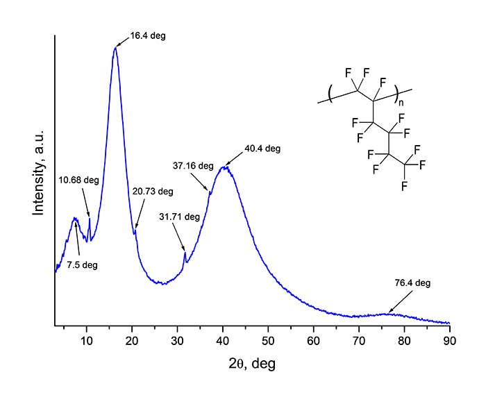 Synthesis of perfluorinated homo- and copolymers at ultrahigh pressure occurs by a radical mechanism [4, 5], and both amorphous and partially crystalline materials can be formed. Structural diagnostics of homopolymer H1 was carried out via wide-angle X-ray diffractometer Rigaku Miniflex600 (Cu,λ= 1.54184 A) in 2θ angle range from 3 to 90 deg. (with a step of 0.02 deg.). The diffraction pattern of the film deposited to a glass substrate by drying a solution of homopolymer H1 in perfluorodecalin is shown in Figure 4. As follows from Figure 4, wide “halos” in diffraction pattern near 2θ ≈ 7.5, 16.4, 40.4 and 76.4 deg. are observed. In addition to these halos, sharp peaks are also visible at 2θ ≈ 10.68, 20.73, 31.71 and 37.16 deg. This type of X-ray diffraction pattern indicates the partial crystallinity of studed material. Note that freshly deposited H1 homopolymer films are transparent. However, over time they acquire some dullness, which may be a consequence of formation of polycrystallites (lamellas).