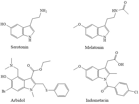 5-Oxyindole derivatives (5-OI) occupy a special place in the physiology of the higher nervous system. Serotonin plays an important role of the neurotransmitter of the human CNS by regulating the transmitting pulses processes in the neurons of the cardiovascular, endocrine and other physiologists of important body systems [1, 2]. The similar to it by the structure, hormone melatonin is involved in the change control in the day and night rhythms of living organisms [3]. The synthetic derivatives of 5-OI – indomethacin and dimecarbine, for many years are used in medical practice as an anti-inflammatory and hypotensive agent, respectively [4]. The domestic Arbidol medication strongly holds the position on the market of antiviral medications [5,6].