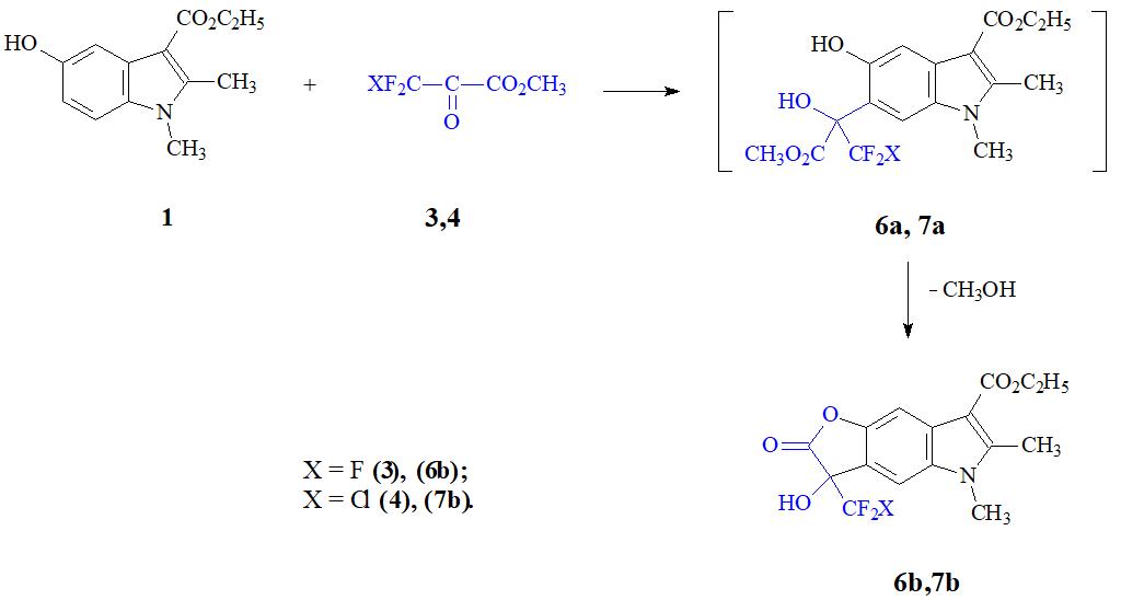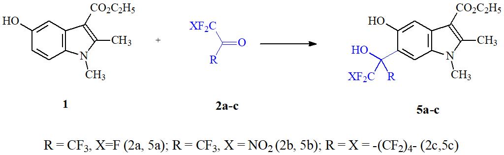 Having studied the patterns of reactions of polyfluorocarbonyl compounds with phenols, naphthols, polyphenols, phenolates, 8-oxyquinolines [11], we found the convenient method of one-step fluoroalkyl modification of 5-ОI on the example of reaction of polyfluoroketones with ethyl ester of 5-oxy-1,2-dimethyl-1H-indole-3-yl carboxylic acid 1 - dimecarbine [4]. In these transformations, hexafluoroacetone 2a, nitropentafluoroacetone 2b, perfluorocyclohexanone 2c, trifluoropyruvic acid methyl ester 3, as well as the relatively recently described methyl difluorochlorpyruvate 4, were used as electrophilic agents [12].