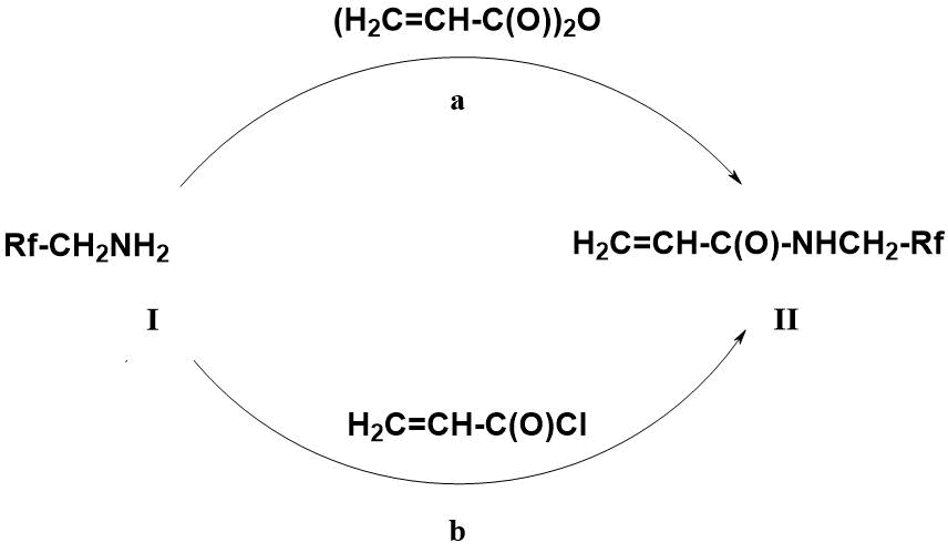 Generally, N-fluoroalkylacrylamides of formula II are prepared by reacting fluorine-containing alkylamines I with anhydrides (a) or acid chlorides (b) of acrylic acid in the presence of acceptors (NEt3, Py) released in the reaction of acids [9, 10] (Scheme 1).