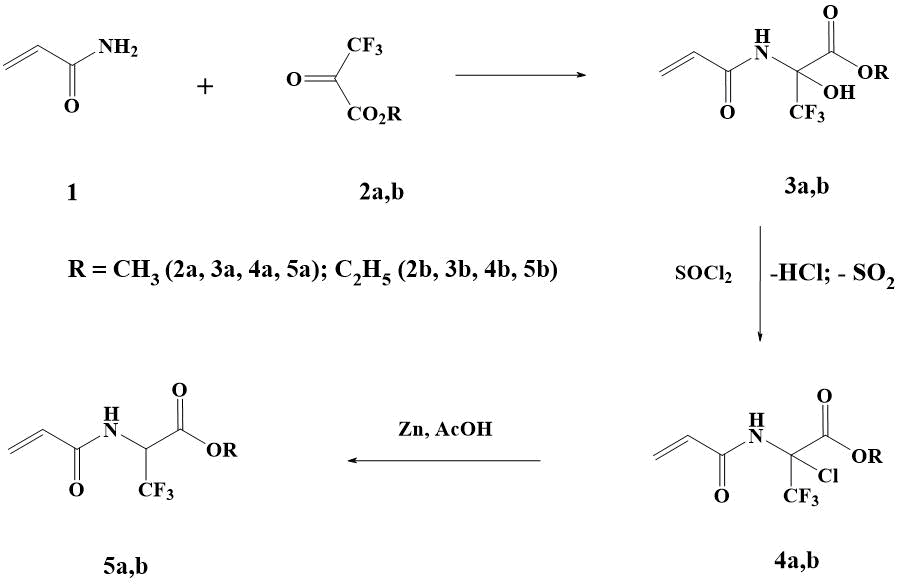Recently, methyl (2a) and ethyl (2b) esters of 3,3,3-trifluoropyruvic acid have been shown to react easily with acrylamide (1) to form N-oxyamidoalkylation products (3a,b). As a result of the conversion data, methyl (3a) and ethyl (3b) esters of 2-acrylamino-3,3,3-trifluoro-2-hydroxypropionic acid are formed with a preparative yield of more than 90% (Scheme 3). It is also shown that in the initiation of AIBN 3a,b is polymerized [16].