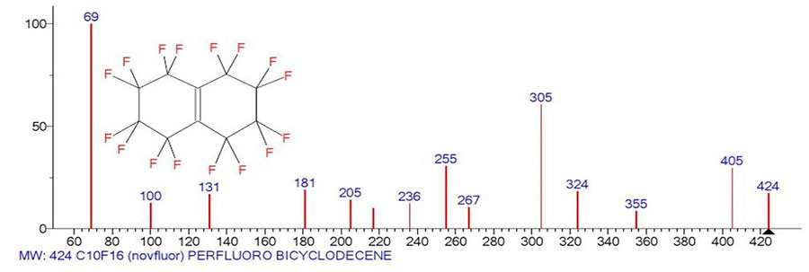 This report presents mass spectra of four perfluorobicycloisomers of C10F16 from NIST libraries. One of them is perfluorobicyclodecene, and the other three isomers are tetradecafluoroindene derivatives with the CF3 group in the 3-, 8-, and 2-position. Figure 1 the mass spectrum of perfluorobicyclodecene and Figure shows its ion series.