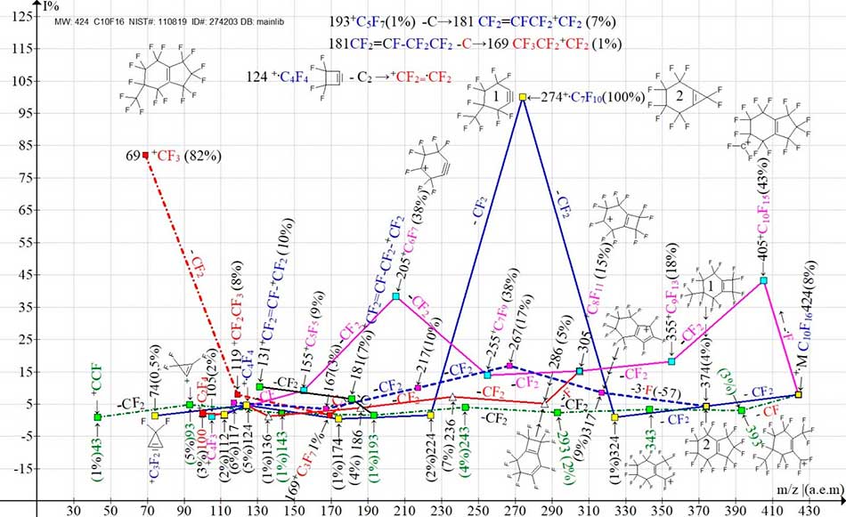In the spectrum of the cis-isomer (Fig. 6) two ion series appear: a series of intense peaks and a series of low-intensity peaks. The low-intensity series of six peaks with the last significant mass digit "2", formed as a result of six successive emissions of CF2 (blue line-yellow square) is completed by the ion +.С4F6 with m/z 162 (1%). It is likely that when the perfluoroacetylene molecule is detached, it is converted into the ion +.C2F4 (4%). In the same series, after the first detachment of CF2, a secondary synchronous emission of three fluorine atoms occurs, probably from a five-membered cycle. The weak peak series branches to form a new intense series of ions with the last significant mass digit "5". In the new series of ions, marked by the blue dotted line - purple square, an intense ion with m/z 305 (41%) +C8F11 appears. The most intense peak series (purple line - blue square), with the last significant digit "3", appears as a result of the primary detachment of one fluorine atom and seven successive ejections of CF2. Seven successive ejections of CF2 allow us to conclude that the primary detachment of the fluorine atom occurred from the cis- position.
