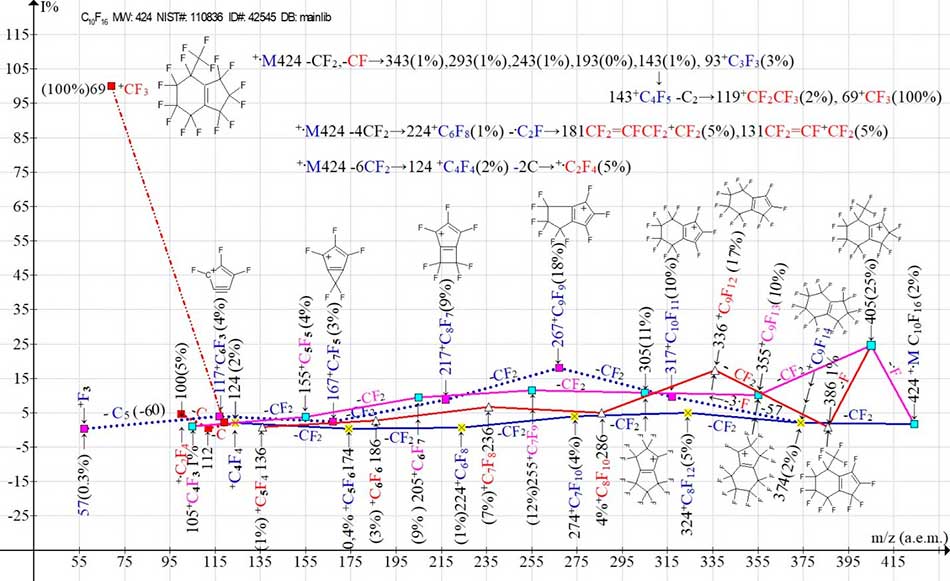 Figure 4. Three main ionic series (M -.F, M -CF, M -CF2) and their branches in the mass spectrum of perfluoro [8-methylbicyclo[4.3.0] nona-1(6)-en] C10F16 MW: 424 Institute of Organic Chemistry, USSR Academy of Sciences NIST#: 110818 ID#: 42546 DB: mainlib.