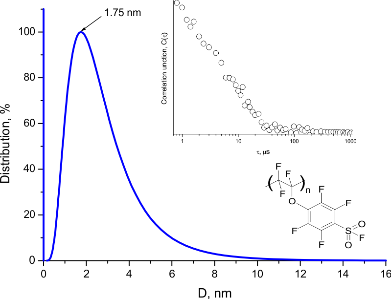 For the estimation of E8S homopolymer molecular weight the average hydrodynamic diameter of macromolecular globules in hexafluorobenzene was measured. The measurements were carried out by the dynamic light scattering method with the help of 90Plus_Zeta particle/protein analyzer (Brookhaven Instruments Corp., USA) with the laser illumination of 640 nm wavelength. A typical histogram with size distribution of the globules is presented at Fig. 2. Average globule diameter observed equals to <D> = 1.75 nm. Thus, E8S homopolymer, synthesized by radical polymerization under the ultrahigh pressure can be classified as the substance with moderately high molecular weight.