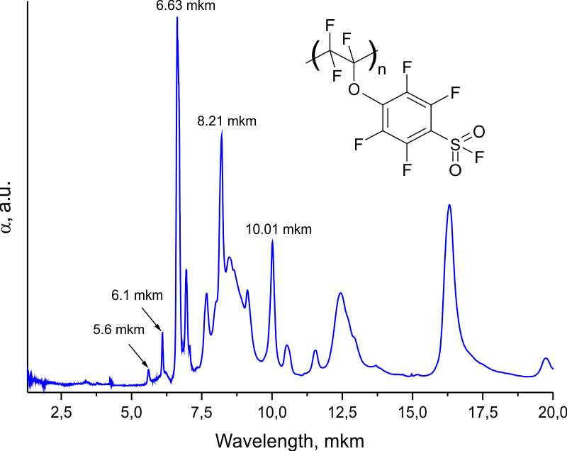 Converting chemical energy into electrical energy electrochemical devices and, particularly, hydrogen fuel cells with proton-exchange membranes are of great interest for scientific researches and industry due to their high energy conversion efficiency, low environmental impact, wide applicability in various fields ranging from portable electronic devices to automobiles, trains, vessels, aircrafts and space vehicles [1]. Proton-exchange membrane is one of the key elements of a fuel cell. It supports transport of protons, produced in hydrogen catalytic oxidization at the anode, participates in oxygen reduction with water formation at the cathode and also prevents unimpeded uncontrollable interaction of hydrogen with oxygen [2 - 3]. Currently low temperature fuel cells with proton-exchange membranes made of fluorinated sulfonic-acid polymers acquired significant distribution, for instance, with commercially available membranes of Nafion, Aciplex, Aquivion, Dyneon. Membranes of that type exhibit high chemical, thermic and mechanical stability, have appropriate proton conductivity under high hydration degree [4-10]. An immense number of fluorinated monomers, particularly, with various protogenic groups have been synthesized for the development and the fabrication of proton-exchange membranes [11-20]. Proceeding in this way, we have elaborated a new Nafion-like monomer, namely FSO2C6F4OCF=CF2, in which FSO2- group is tied to CF2=CFO- substitute by perfluorophenyl fragment, rather than perfluoroaliphatic one [21]. The present work deals with the investigation of the polymerization capability of the monomer.
